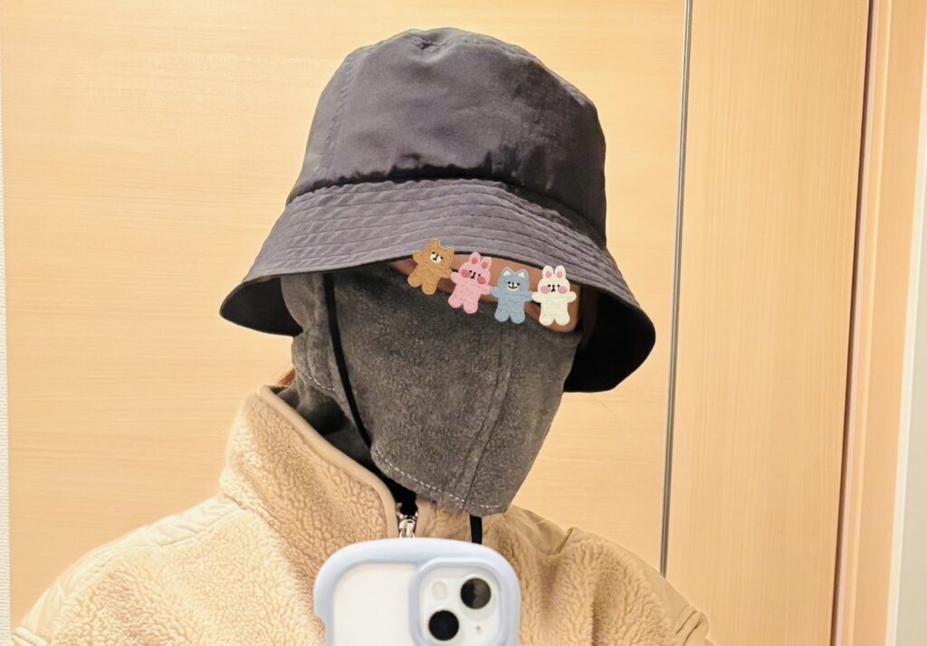 しかも、鼻も冷たくなるから前まではマスクしてキャップ被ってたけど、会社に着いたらまつ毛、前髪がビッショビショになってすごい恥ずかしかった経験があるんだよね……。でもヤケーヌは口元に穴が空いてるから息苦しさが無いし、目元から上に蒸気が上がってくることもないのよ!! ハチもメガネが曇らないって言ってたけど、冬用も全く同じ。穴が空いてるからすき間風は若干あるけど(笑)全然耐えられる!