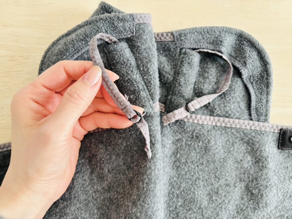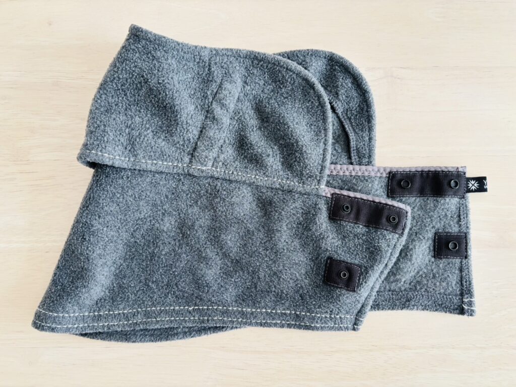 これは夏用も同じ仕様で、耳紐が付いてて長さ調節ができるのと、首の後ろにスナップが付いてて被らなくていいから髪型が崩れないのが便利だね。夏用のヤケーヌは面ファスナーの物も持ってるけど、ビリビリするとうっかり布を引っかけちゃって毛玉が出てくるから、個人的にはスナップが使いやすいかな。