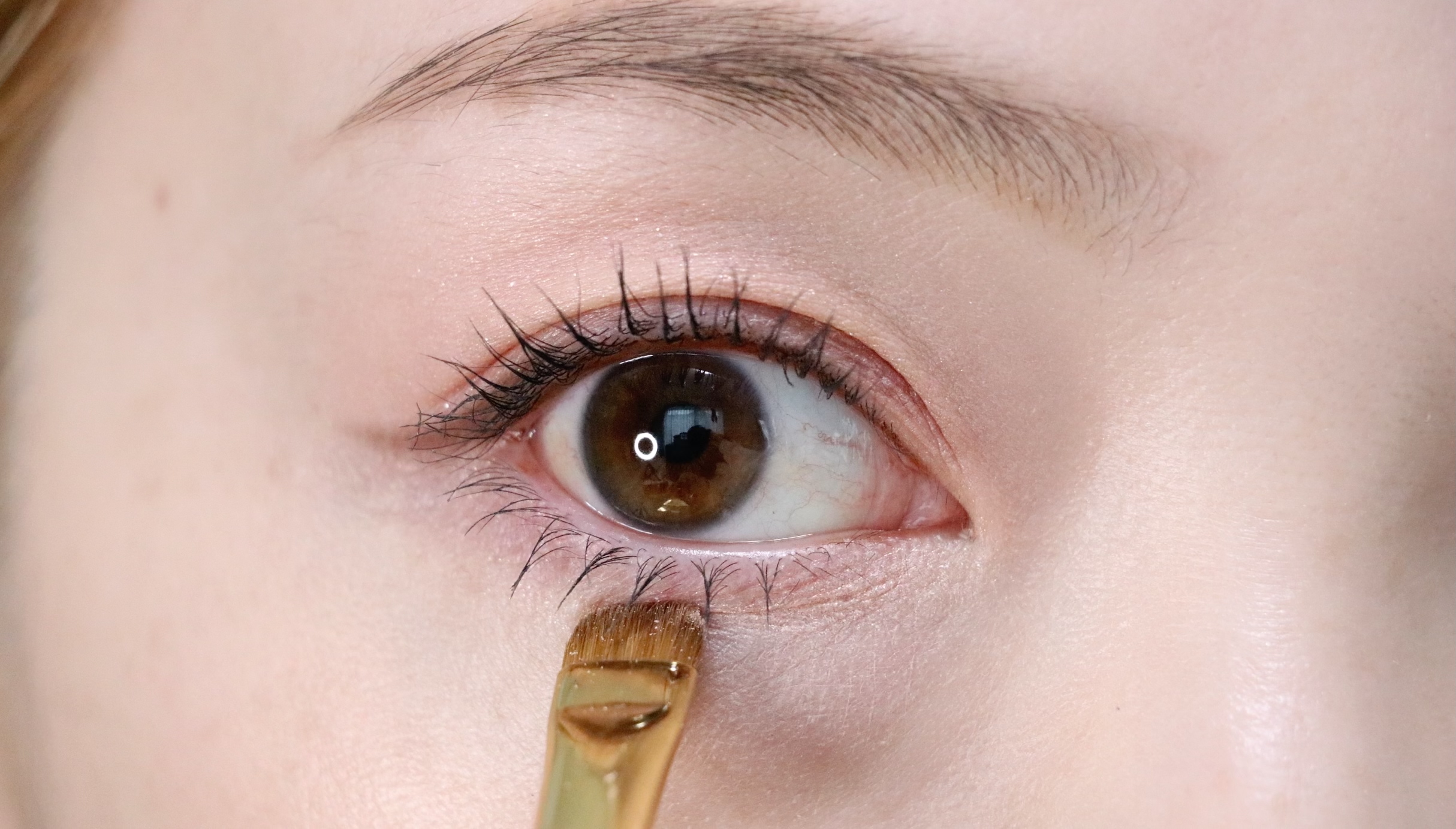 筆先にとって、肢を下向きにしてまぶたに優しく抑えながら、目のキワから埋めていきます。