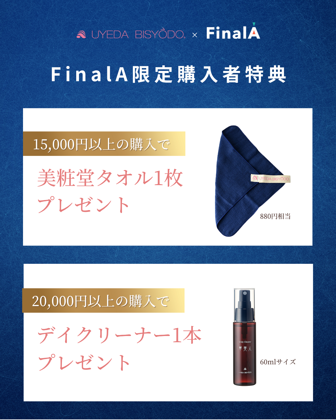 購入者特典で、合計金額が15,000円以上の方には美粧堂タオル一枚を、20,000円以上の方にはデイクリーナー60ml一本をプレゼント!!