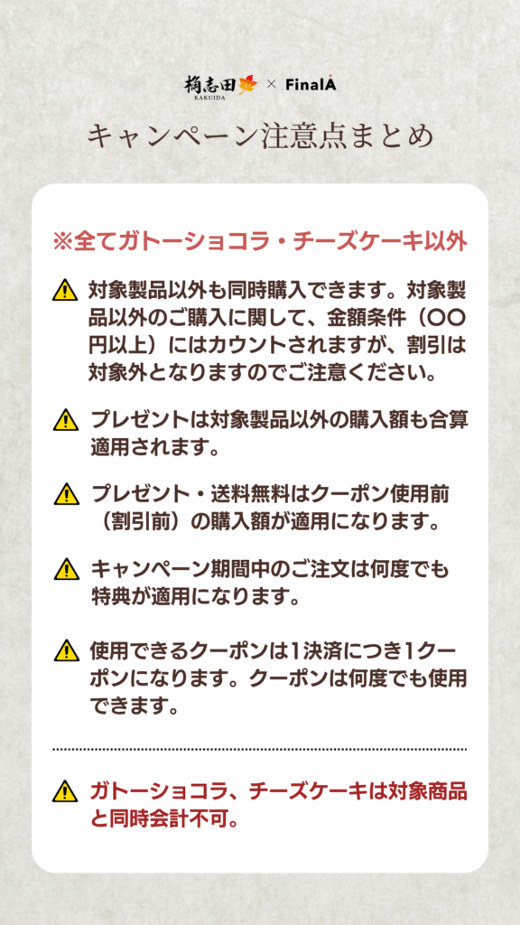 ※対象製品以外も同時購入できます。対象製品以外のご購入に関して、金額条件(〇〇円以上)にはカウントされますが、割引は対象外となりますのでご注意ください。(ガトーショコラ、チーズケーキは同時会計不可)