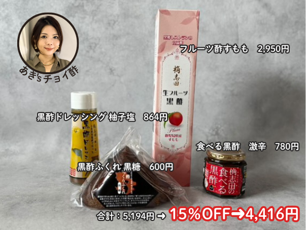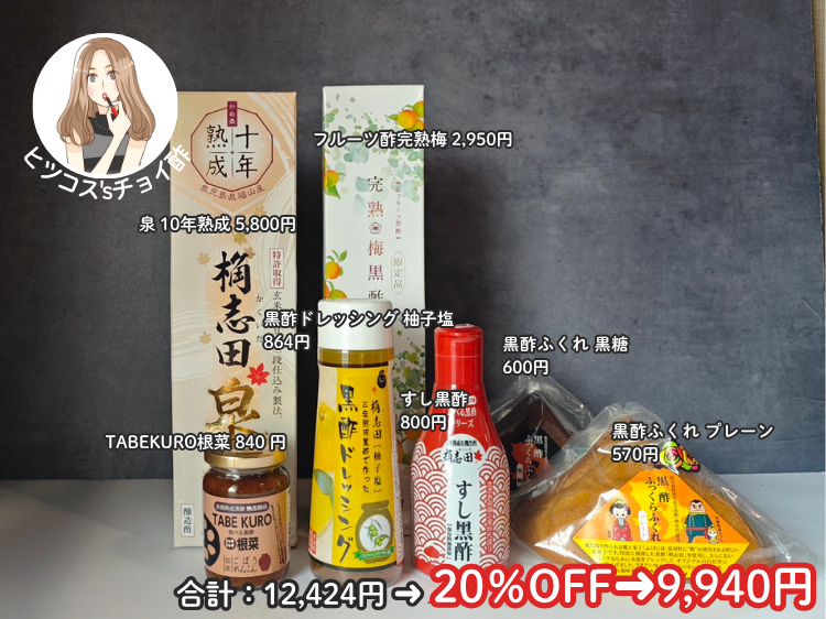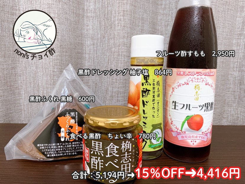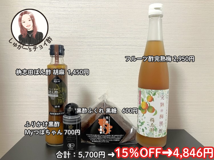 私は会計を2回に分けるつもり!まずは歩ちゃんを3本!そいでプレゼントのジャムとつぼちゃんをGET!そのあと2回目の注文ではこんなチョイ酢にしてみました。泉3年ものが今冷蔵庫に入っていますが今回は10年もの!柚子塩黒酢ドレッシングは個人的にオニドレを超えた超好みの味!!柚子の爽やかさ&コクがたっぷりで野菜よりもお肉にかけてるかも。ハンバーグにかけても美味しい。すし黒酢は酢飯をこよなく愛する人にはぜひ買って欲しい。自宅で理想的な酢飯を作れます。正直この酢飯で納豆ご飯にするだけでうんまいでーす!ふくれも絶対!黒糖味&プレーン味が推し推しです!保存料を使っていないため賞味期限が短いので大量購入できないのが無念。フルーツ黒酢は完熟梅にしました。前回は人気No.1で売り切れちゃったのでたっぷり在庫を入れてもらってます。ご飯が消えるTABEKUROは根菜味。もう5個ぐらい食べきってます。これで1万円以上の購入なのでまたジャムをもらうどー!