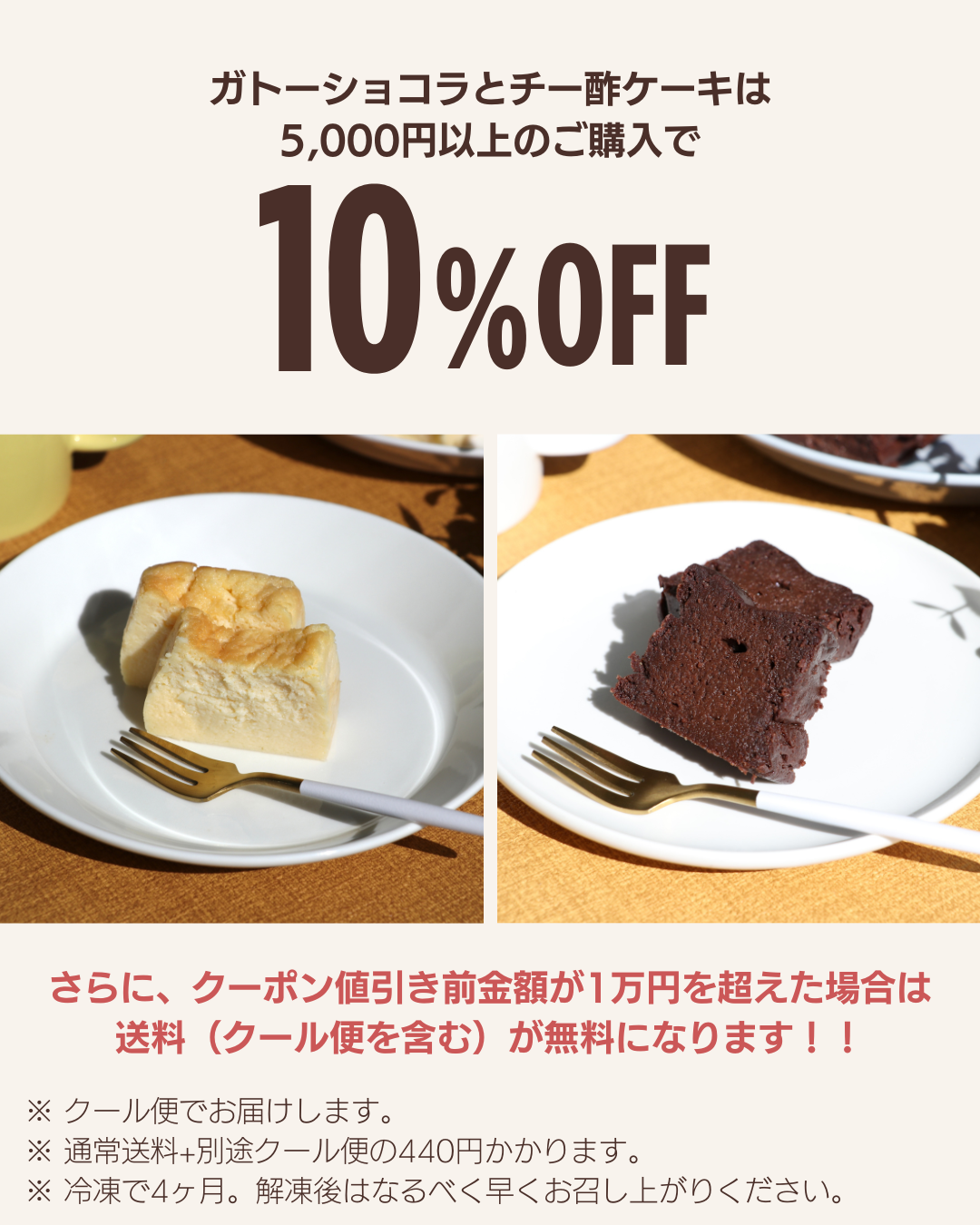 ガトーショコラとチーズケーキは通常送料+クール便440円が別途かかります。常温の製品と別配送になります。