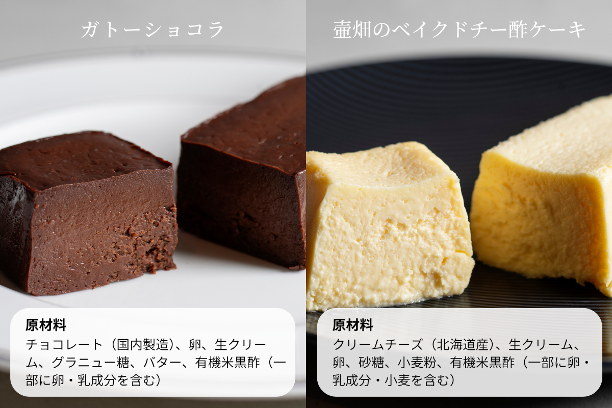 熟成黒酢を使用した濃厚チー酢ケーキと生チョコのようなガトーショコラ!