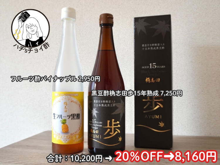 生フルーツ黒酢は味見だけで留めておくつもりがガンガン飲んでしまい、異常に少量なタイミングで撮影してしまいました。この量で届くわけではないので(当たり前)ご安心ください!ジューシーでちゃんと生のパイナップル味がするのに、黒酢も味わえる。フルーツと黒酢がこんなにマッチするとは!しっかり味わいたいので炭酸より水で割って飲むことが多いです。程よい甘さでジューズを飲んでいる感覚なのに罪悪感をあまり感じなくて済むのがうれしい!そして、黒豆酢の「歩」はレベチ!!タンパク質多めを意識すると脂質が少なくなってしまって便秘になりがちなのですが、歩がある今は全く問題ありません!!「桷志田有機3年熟成」も食後の血糖スパイク防止されていて眠くなりにくい体感もあるし、便通にも良い。味もコクと酸味が楽しめて酢ばらしいのですが、やはり歩の方がまろやかで飲みやすさもあるし、腸スッキリ度が高い!! 歩は酢界の帝王では!? ちなみに、さらにクエン酸(レモン)を追加して運動疲れを吹っ飛ばしております!個人的には、歩が一番レモンと合いました。