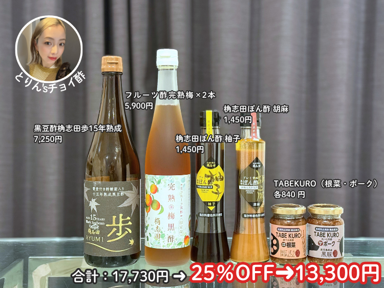 黒酢生活を始めて10ヶ月!すっかり生活の一部となり、リピートする酢が絞られてきたのでそちらをピックしました!まず私が毎日摂るのが歩+フルーツ酢のソーダ割りです!食前(特に眠くなる昼)には必ず飲んでいます。フルーツ酢は何種類か飲ませていただきましたが、完熟梅が圧勝!!しゅがーさんもおっしゃってましたが、梅酒ですよこれは!なくなるペースが早いので、完熟梅は2本確保したい!(もしかしたら3本いくかも…)フルーツ酢だけで飲むのもありですが、黒酢パワーを味方につけるならぜひ歩も一緒に入れてください!!歩を入れることでより酸味と深みが増して、さらに歩特有の酢酸菌も摂れちゃうから最強ドリンクなんですよ。暴飲暴食期のときも完熟梅歩ソーダがあるだけで、血糖値の爆上がりを防げるので罪悪感ゼロです!調味料はどれも捨て難いですが、特にハイペース出なくなるのがポン酢とTABEKUROです!これから鍋のおいしい季節!桷志田のポン酢があれば白菜が飲み物になりますTABEKUROは歩と混ぜて餃子のタレにすると無限に食べられるのでぜひお試しください!チーズケーキとガトーショコラもうますぎたので別会計でいかせていただきます!!
