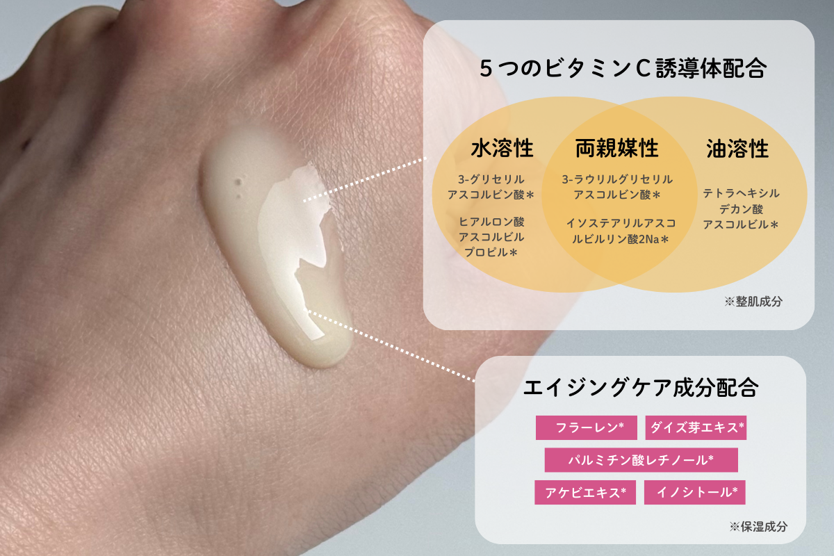 浸透*1が高く、刺激になりにくいビタミンC誘導体を5種類も配合。さらに、セラミドをはじめとした5つのバリアケア成分が入っているので、敏感肌の方でも使いやすいビタミンC美容液です。
