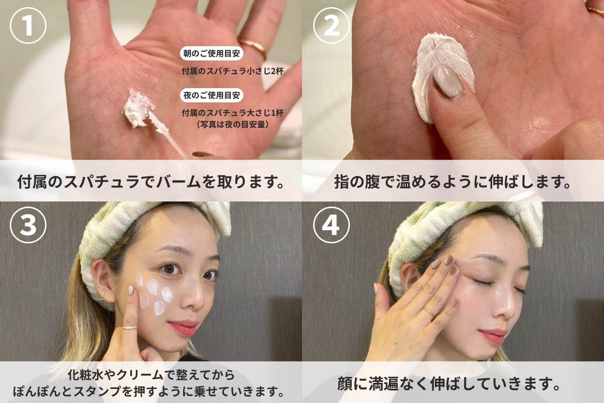 化粧水・美容液で肌を整えた後に、バーム大さじ1を使います。大さじ3使うとナイトパックとしてもお使いいただけます。ニキビには小さじ1を覆うように重ねおきするのがオススメです!