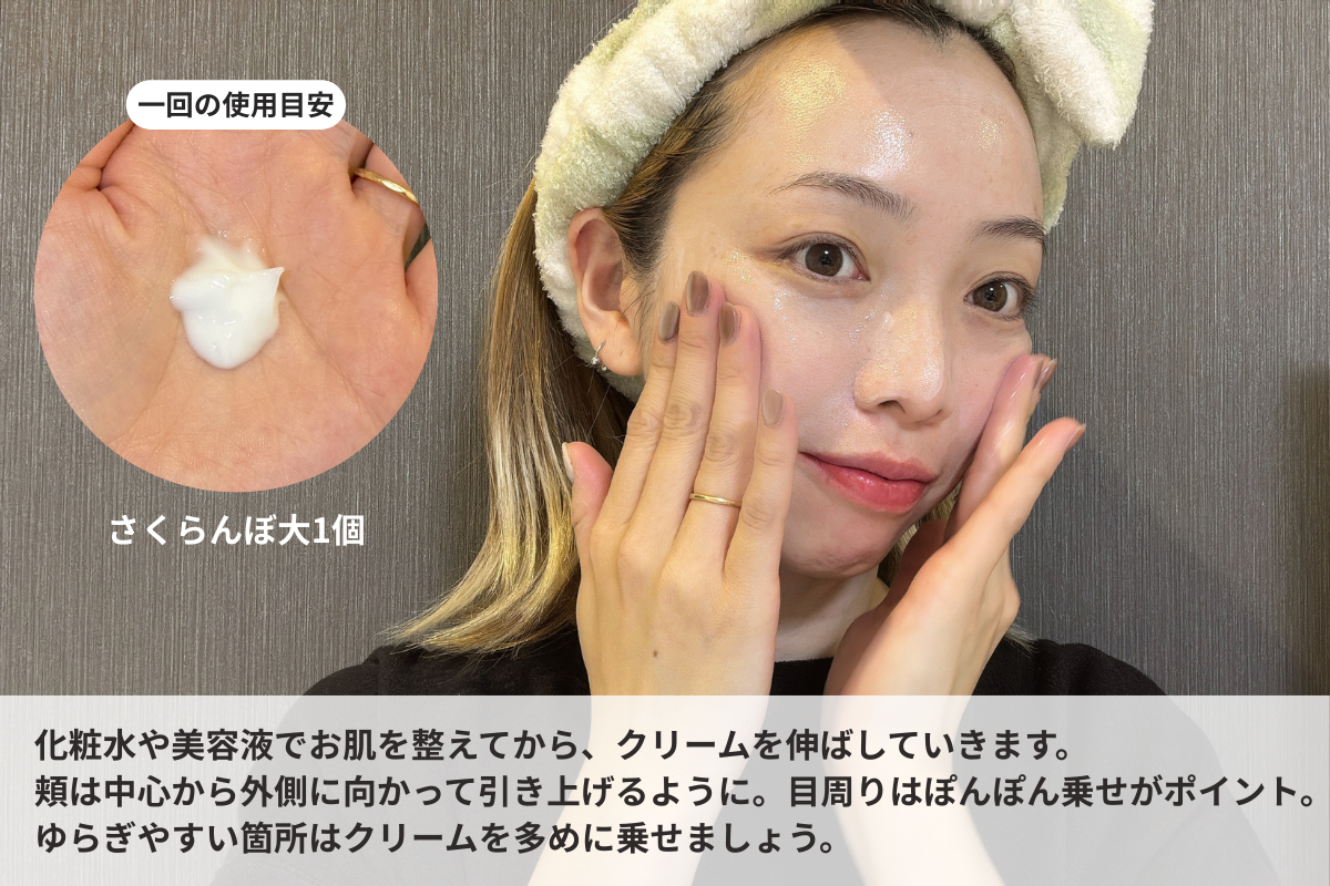 化粧水・美容液で肌を整えた後に、さくらんぼ大1のクリームを肌に優しく馴染ませます。