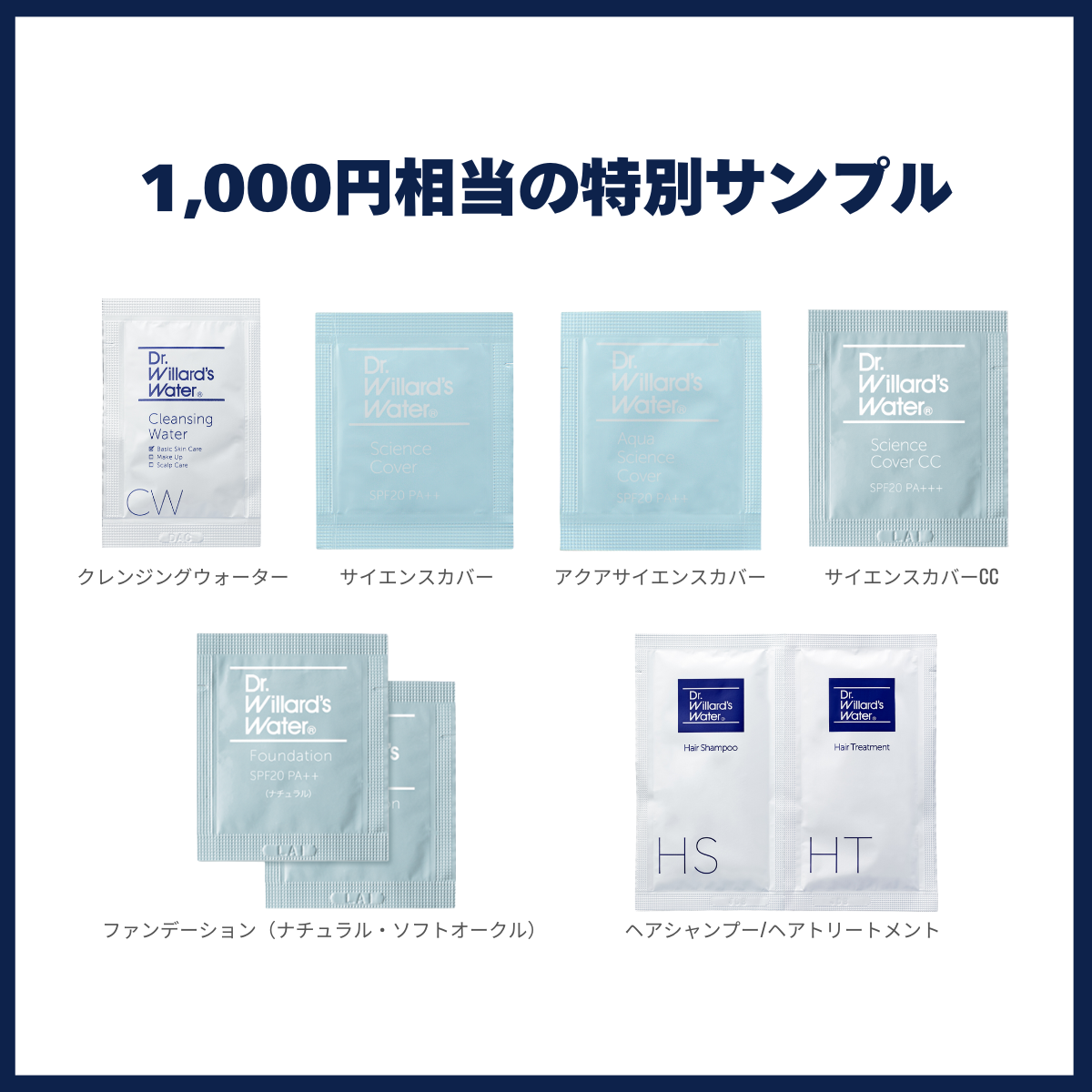 クレンジングウォーター/サイエンスカバー/アクアサイエンスカバー/サイエンスカバーCC/ファンデーション(ナチュラル・ソフトオークル)/ヘアシャンプー/ヘアトリートメント 各1個