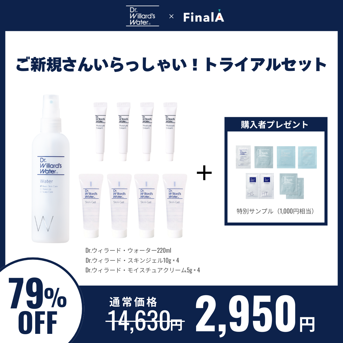 トライアルセットには、Dr.ウィラード・ウォーター現品(4,070円)を含む、14,630円相当のアイテムが2,950円で買えるのは超お得!小さなお子様も使えるので、1セット買って家族で試すのもありですよー!